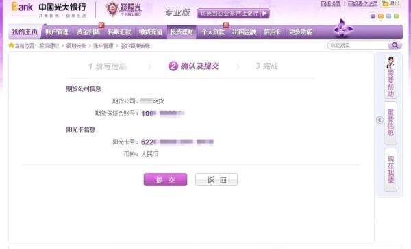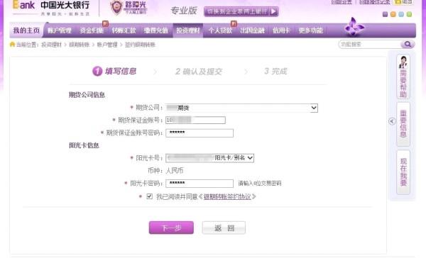 6、選擇“中(zhōng)銀國(guó)際期貨有(yǒu)限責任公(gōng)司”,填寫期貨保證金賬号、期貨保證金賬号密碼(期貨賬戶資金密碼),選擇相應銀行賬号,輸入卡密碼(銀行卡取款密碼),在我已閱讀并同意前打鈎,點擊“下一步”,圖下圖。