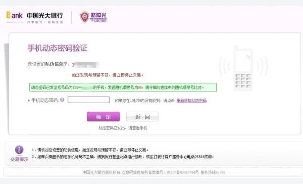 3、核對信息無誤,點“确定”,再點擊“下一步”,輸入“手機動态密碼”,點擊“确 定”,如下圖。